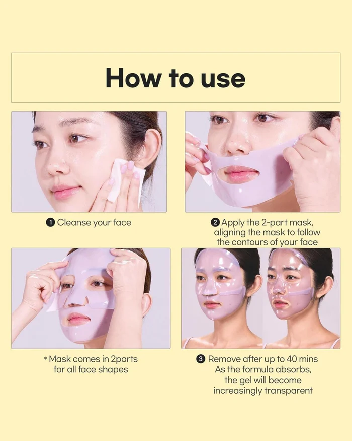 Cleanse and pat dry your face. Apply the two-part mask to fit your face’s contours. Leave on for up to 40 minutes, or overnight for enhanced results. As the essence absorbs, the gel becomes more transparent — then remove and pat in the remaining essence. Follow with moisturizer.
